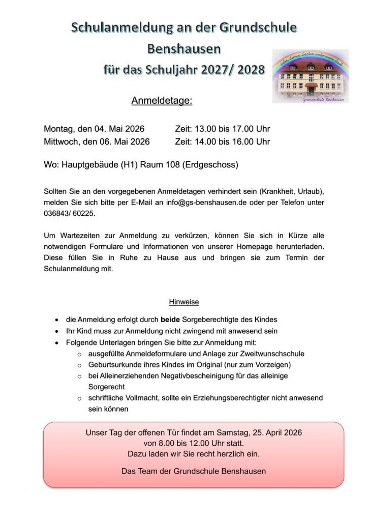 Schulanmeldung für das Schuljahr 2027/2028 Veröffentlicht am 28. März 202514. April 2026 von grundschule-benshausen Vorheriger Nächster Formulare zur Schulanmeldung